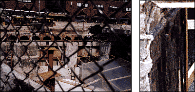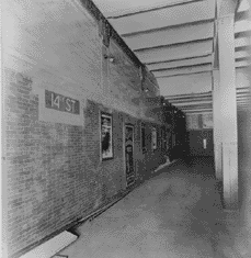THE DESIGN OF the 14 Street Station was similar to that of Brooklyn Bridge, in that it had two center island platforms, which are still in use today, in addition to two side local platforms, which are no longer in passenger use. These two photos show the local platforms at 14 Street -- the uptown platform is shown above, and the downtown platform is below. Both had staircases that connected them to the mezzanine, which is still used today. There has been a lot of renovation work lately in this section of the Union Square station complex. Parts of the original local side platforms are now in fact visible through cutouts and gaps in the side walls. |