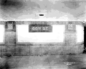 SIXTY-SIXTH STREET Station has the same design as Astor Place and 50 Street stations, with the number "66" instead of an "A" or "50". Like all of the upper west side stations on the original IRT, there are grates in the median of Broadway above that let in natural light to the station. Note that this station is now "66 St. Lincoln Center." |