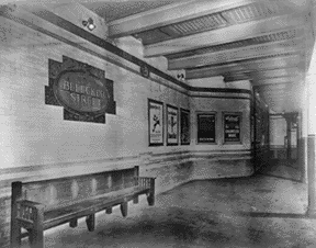 BLEECKER STREET is something of an oddity among the original IRT stations, as it retains all eight of its deep blue name panels, one of which is shown in the photograph. Vault lighting is visible, as it was at Spring Street. The terra cotta "B" along the cornice on the walls is similar to that at Worth, Canal and Spring Streets. |
