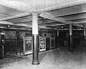 IT IS HARD TO believe that Times Square, the "Crossroads of the World," was once merely another local station on the IRT. The area was called Long Acre Square until the New York Times moved its operations uptown at the same time the new subway was coming through. In fact, because of the erection of the newspaper building, this was one of the trickiest engineering challenges of the IRT; the subway tunnel actually passed right through part of the basement of the new building. Also, the Times had its presses in the basement (below the subway), and subway vibrations were certainly not good for their proper operation. When the IRT was extended north and south of 42 Street in 1918, much of what was then the downtown wall (the southern side) of the station was torn away, to make a connection with the new Times Square station for what is now the 1/2/3/9 lines. The changeover from round pillars to I-beams clearly demarcates the position of the original wall. Some of this wall, however, does survive at either end. AS WAS DESCRIBED on the Grand Central page, when the segment under 42 Street became a shuttle, what was once the downtown express track was covered over with a platform at either end of the segment, so that the remaining three tracks could all be accessed from the Times Square end. What was once the uptown express track actually continues on today beyond Times Square station and merges with the 1/2/3/9 lines, just as it did in 1904; there is a metal walkway over the track. Much of the uptown platform wall remains the same. The elaborate "TIMES SQUARE" name panels are similar to those at Borough Hall on the 4/5 trains. There was once an underpass between the uptown and downtown platforms. It has been sealed over on the downtown (south) side (although vault lighting disks remain in the floor), but the stairway leading to it is still visible on the other side. |